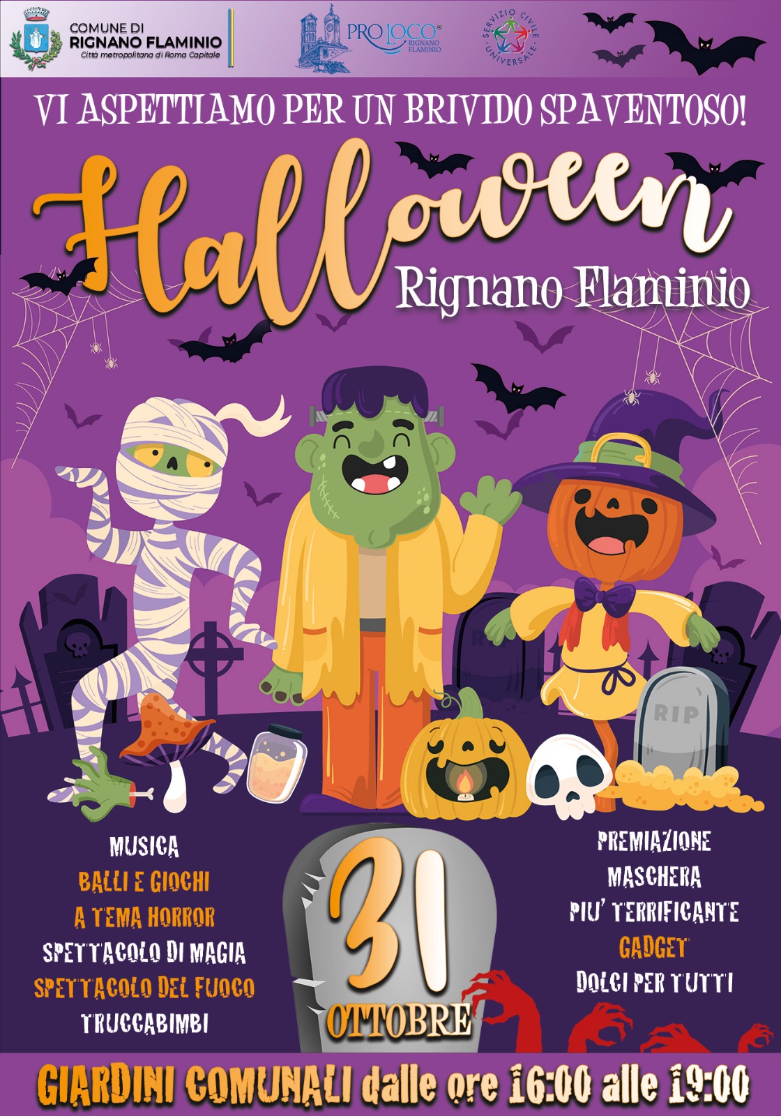 Venerdì 31 ottobre 2025 dalle ore 16:00 alle 19:00 presso i giardini comunali non perdetevi la festa di Halloween con musica, balli e giochi a tema horror, spettacoli di magia, spettacolo del fuoco, truccabimbi, gadget, dolci per tutti e premiazione della maschera più terrificante.