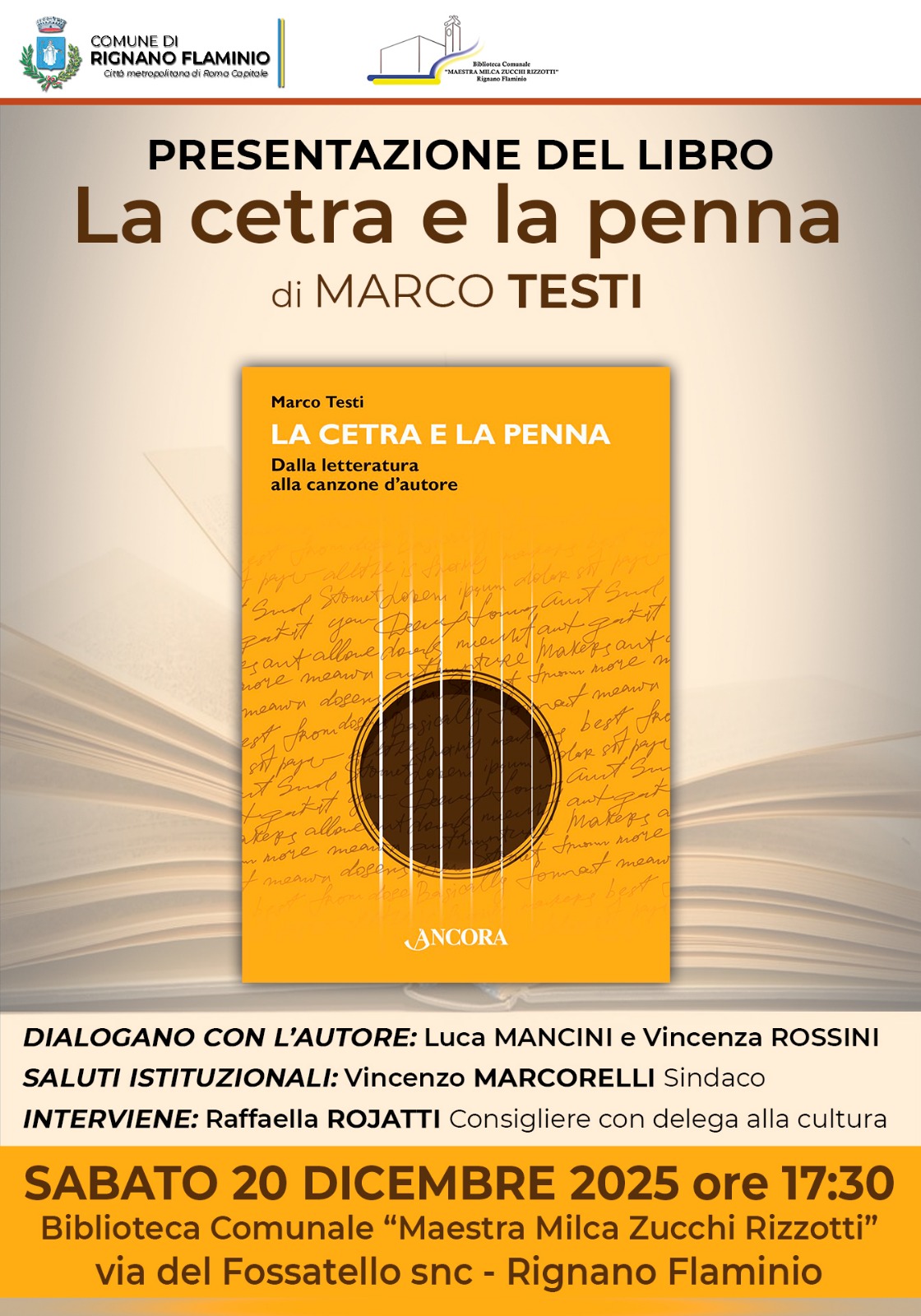 Cos'è? Presentazione del libro "La cetra e la penna" di Marco Testi. Dalla letteratura alla canzone d'autore. Dialogano con l'autore Luca Mancini e Vincenza Rossini Introduce la consigliera Raffaella Rojatti Saluti del sindaco Vincenzo Marcorelli. Parteciperanno Vincenzo Marcorelli Raffaella Rojatti La cetra e la penna Presentazione del libro di Marco Testi