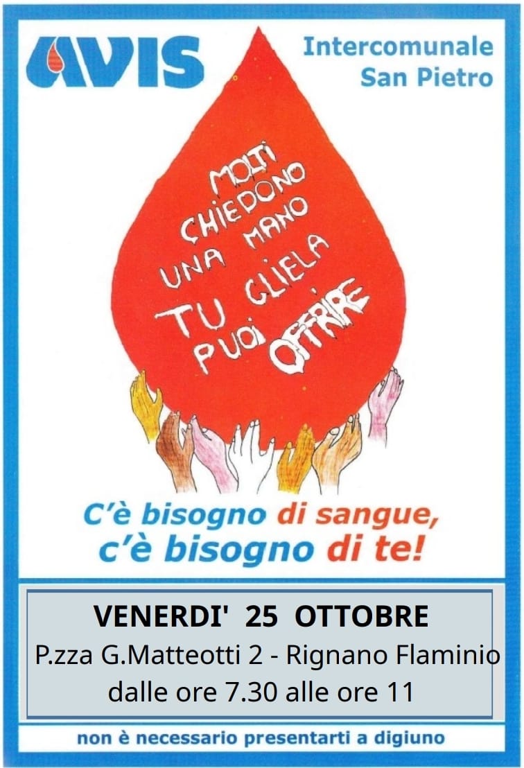 Sabato 25 ottobre dalle 7,30 alle 11 è possibile effettuare la periodica donazione del sangue. Presso Piazza Matteotti 2. Non è necessario presentarsi a digiuno.
