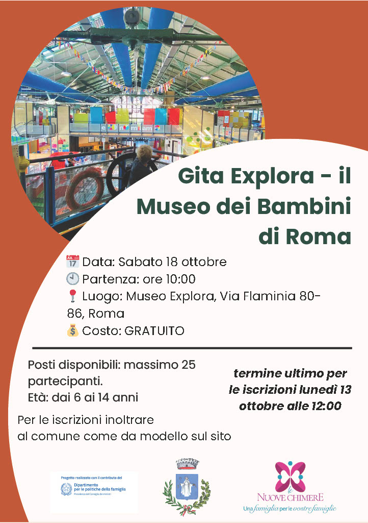 Il Comune di Rignano Flaminio, in co - progettazione con la Coop. Sociale Le Nuove Chimere, organizza una gita ad Explora - Il museo dei Bambini di Roma - per minori tra i 6 e i 14 anni nell’ambito del progetto “Famiglia come risorsa” finanziato dalla Presidenza del Consiglio dei Ministri – Dipartimento Politiche per la Famiglia.
