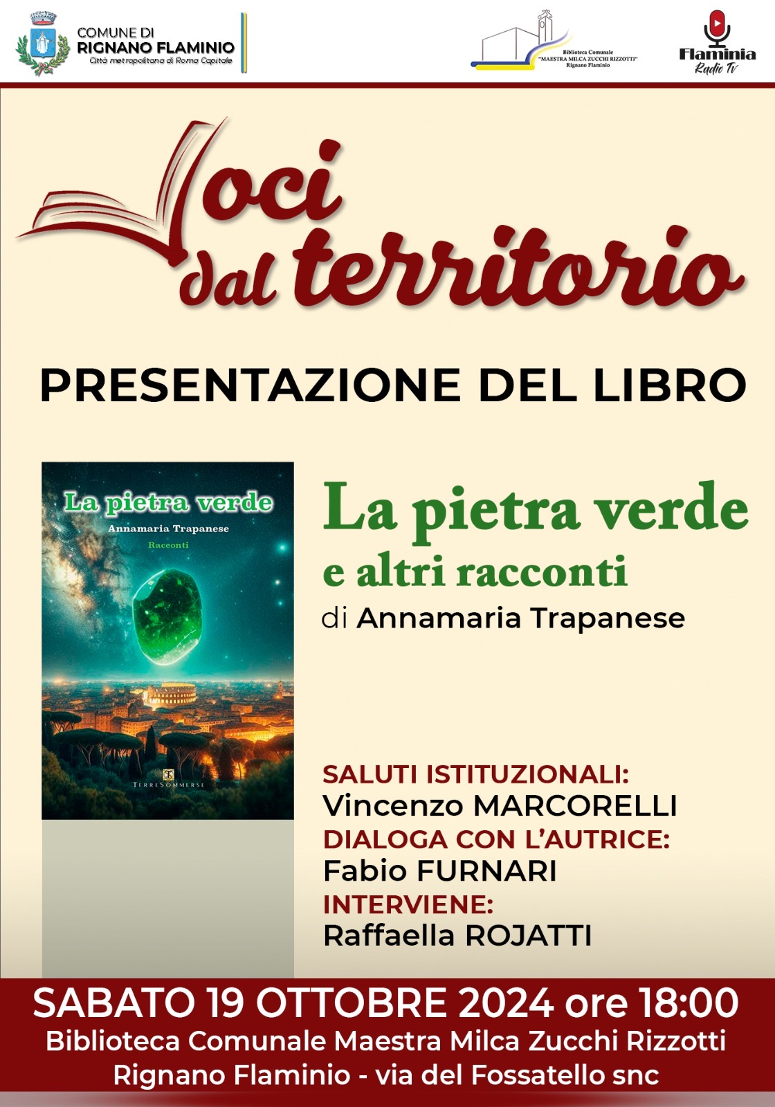 Cos'è? Sabato 19 ottobre tornano le Voci dal territorio con la presentazione dell'opera prima della prof. Annamaria Trapanese. Dialoga con l'autrice Fabio Furnari. Saluti istituzionali di Vincenzo Marcorelli. Interviene Raffaella Rojatti Parteciperanno Vincenzo Marcorelli Raffaella Rojatti